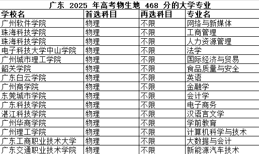 下表是 2025 年广东高考物生地 468 分对应的全部大学专业名单,大家看看有没有自己心仪的!